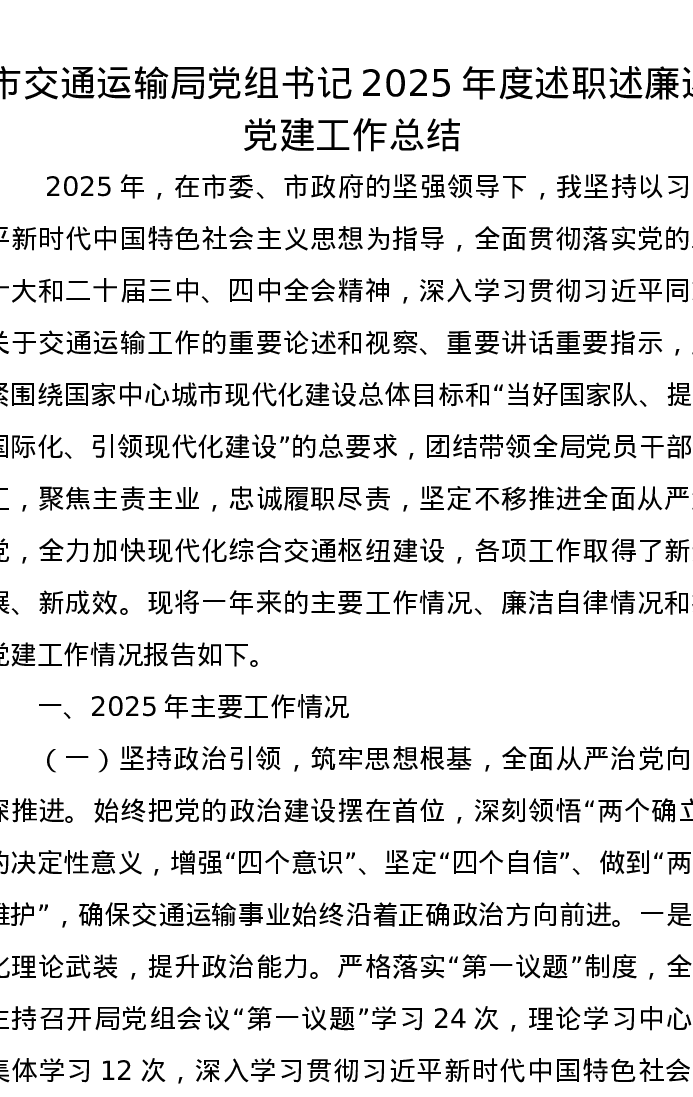 市交通运输局党组书记2025年度述职述廉述党建工作总结