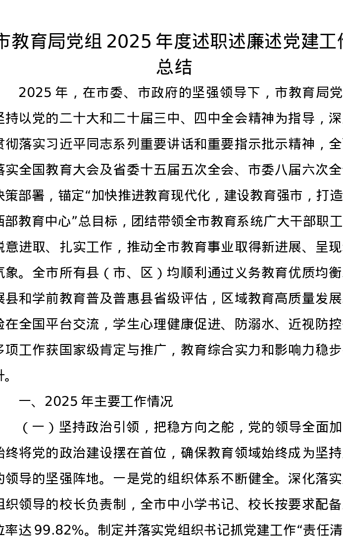 市教育局党组2025年度述职述廉述党建工作总结