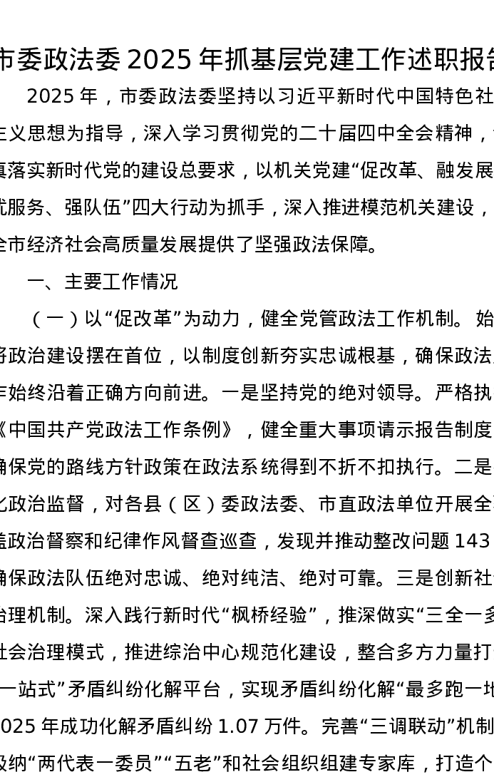 市委政法委2025年抓基层党建工作述职报告