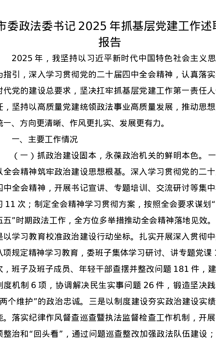 市委政法委书记2025年抓基层党建工作述职报告