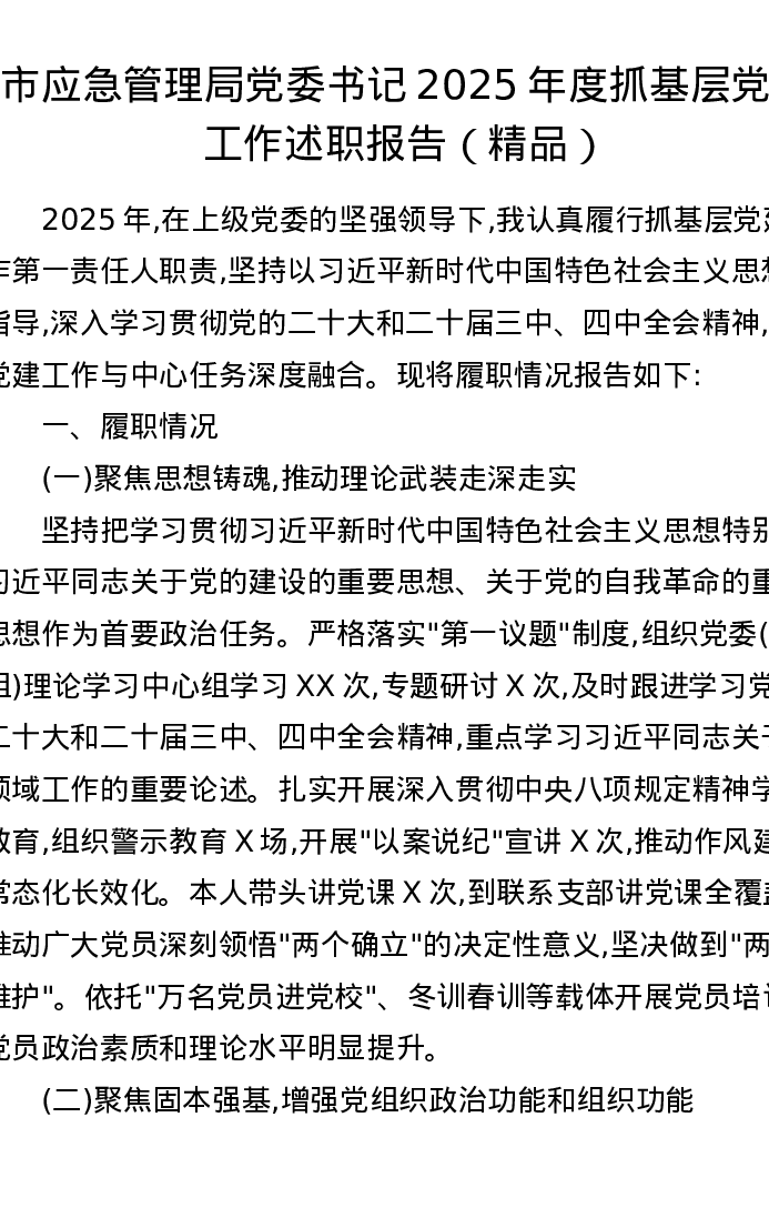 市应急管理局党委书记2025年度抓基层党建工作述职报告