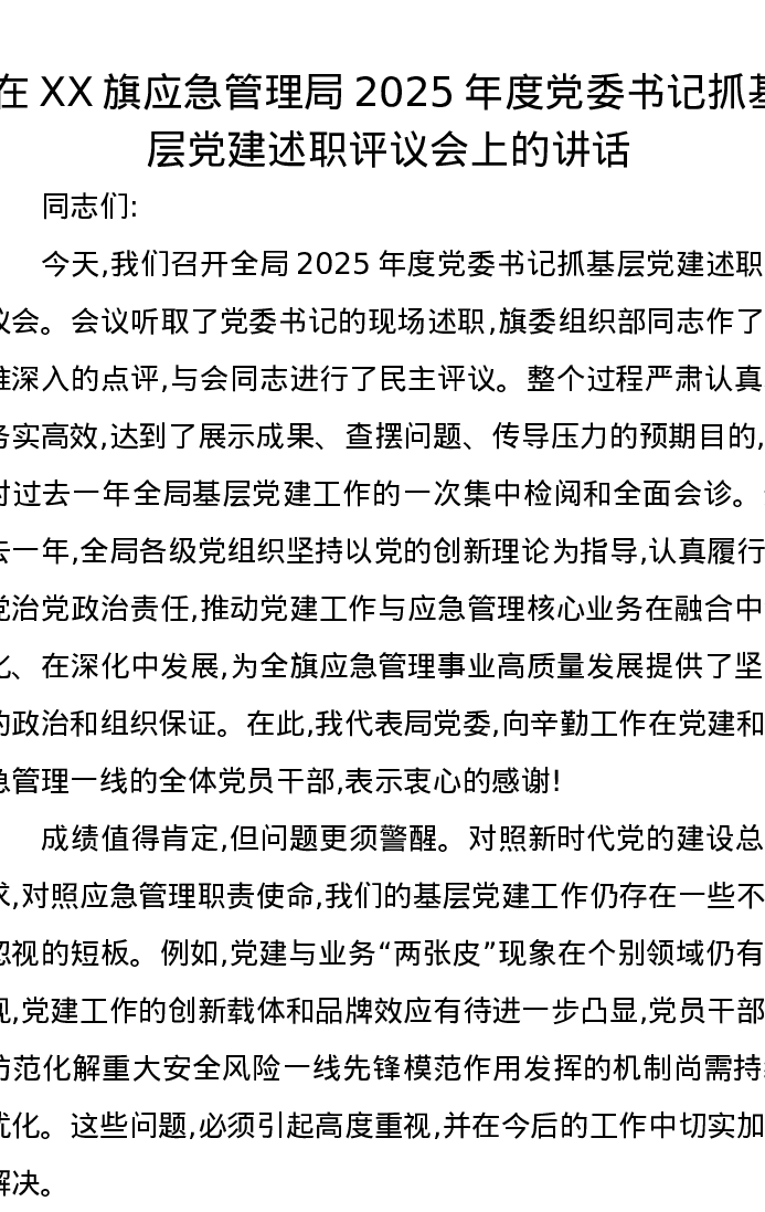 在XX旗应急管理局2025年度党委书记抓基层党建述职评议会上的讲话