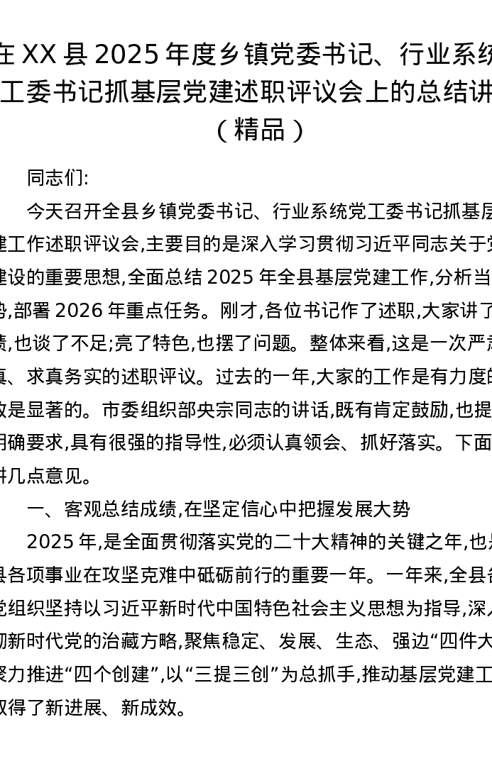 在XX县2025年度乡镇党委书记、行业系统党工委书记抓基层党建述职评议会上的总结讲话