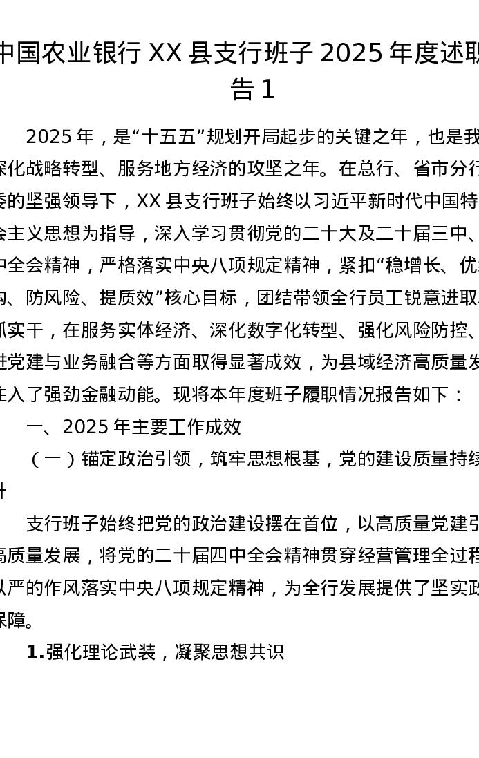 中国农业银行XX县支行班子2025年度述职报告1