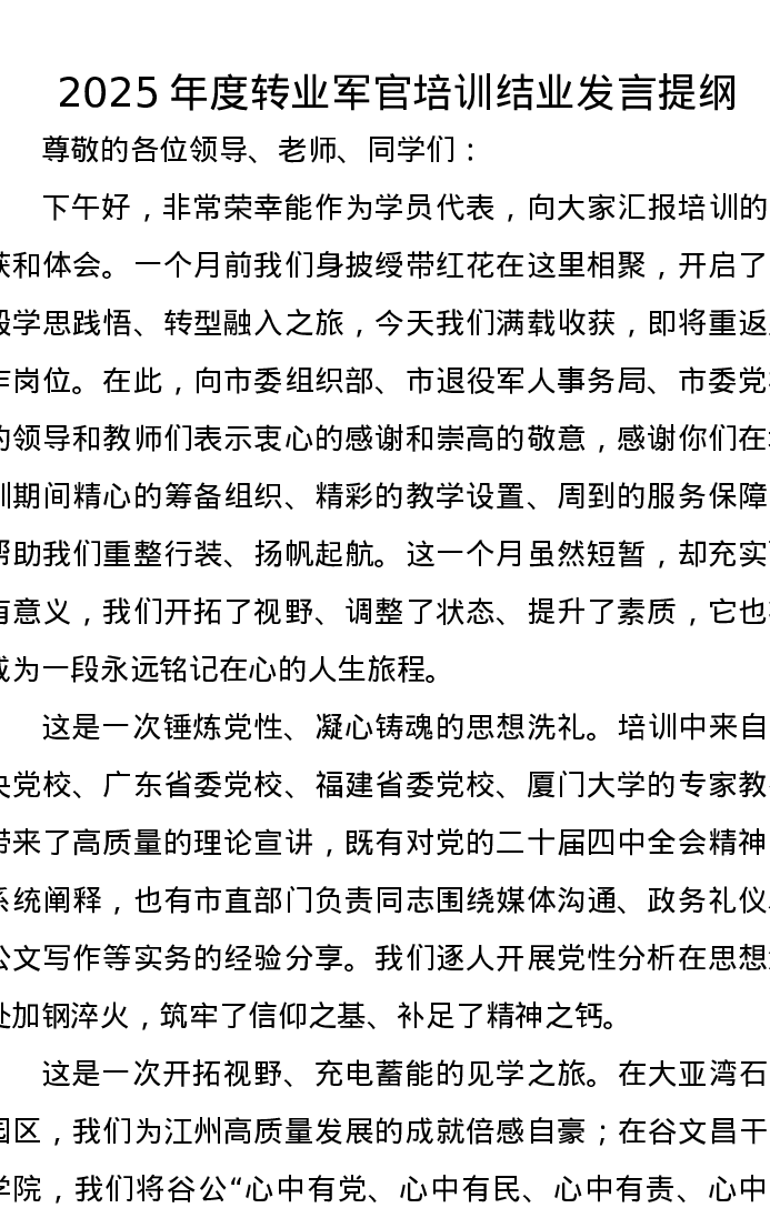 2025年度转业军官培训结业发言提纲