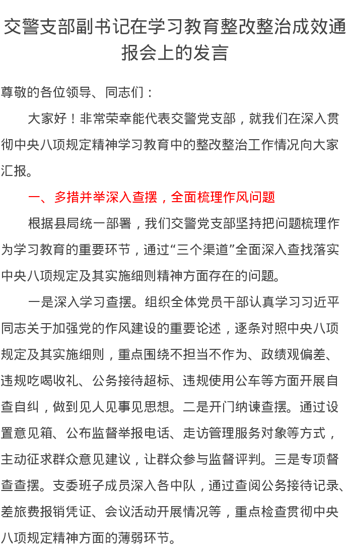 交警支部副书记在学习教育整改整治成效通报会上的发言