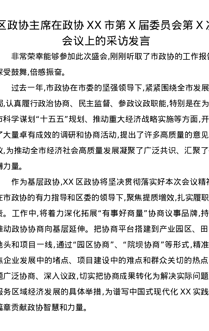 区政协主席在政协XX市第X届委员会第X次会议上的采访发言