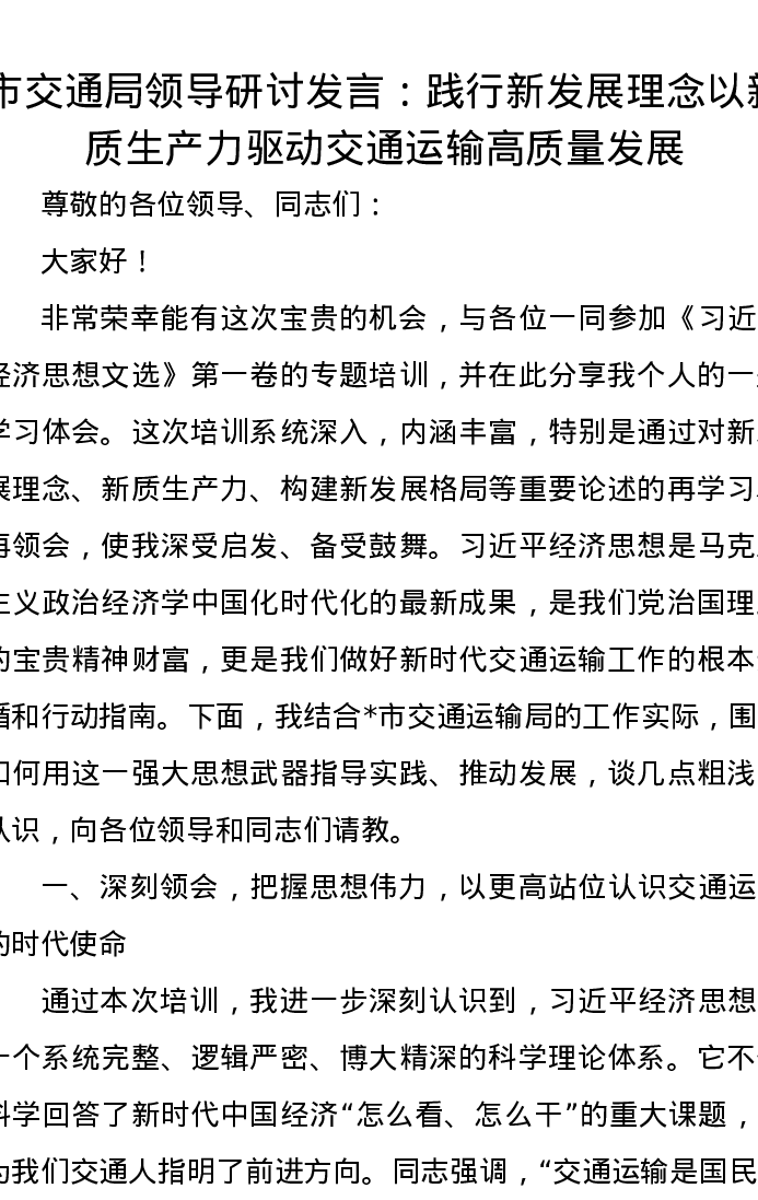 市交通局领导研讨发言:践行新发展理念 以新质生产力驱动交通运输高质量发展