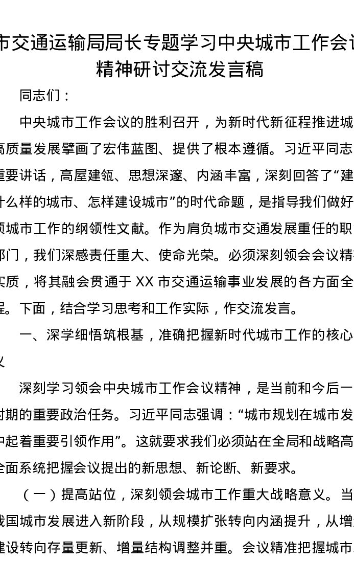 市交通运输局局长专题学习中央城市工作会议精神研讨交流发言稿