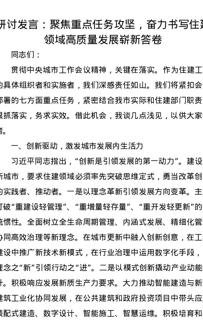 研讨发言:聚焦重点任务攻坚,奋力书写住建领域高质量发展崭新答卷