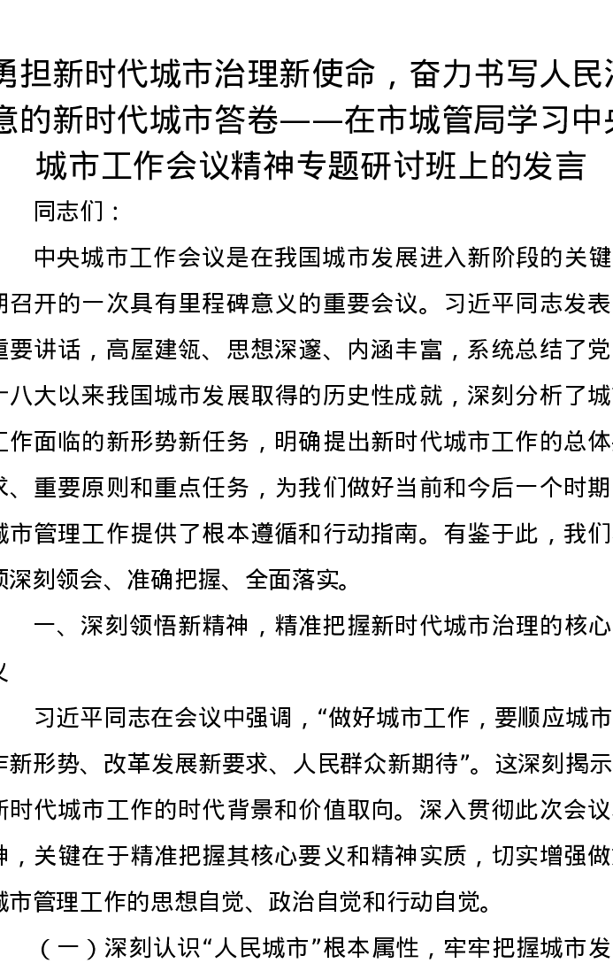勇担新时代城市治理新使命,奋力书写人民满意的新时代城市答卷——在市城管局学习中央城市工作会议精神专题研讨班上的发言