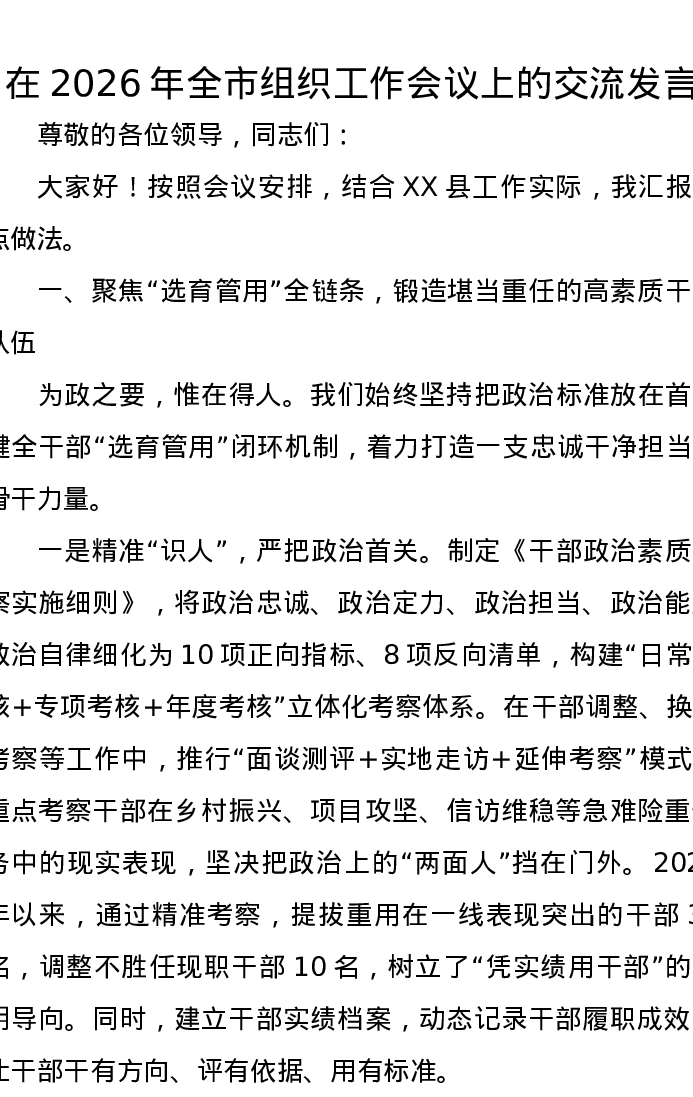 在2026年全市组织工作会议上的交流发言
