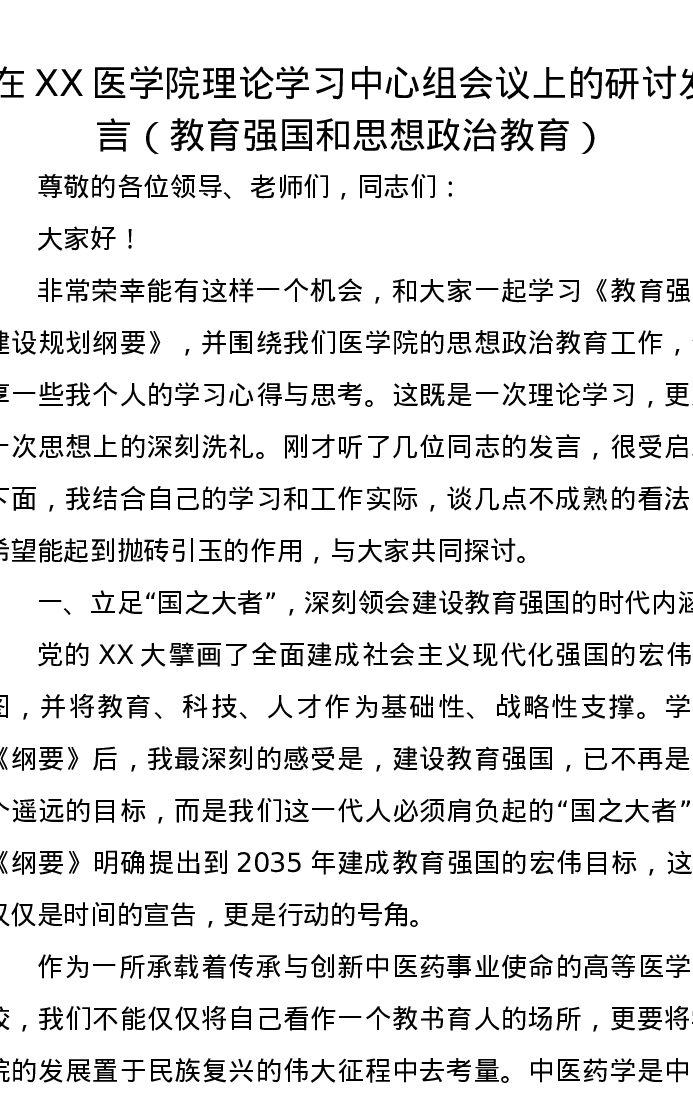 在XX医学院理论学习中心组会议上的研讨发言(教育强国和思想政治教育)