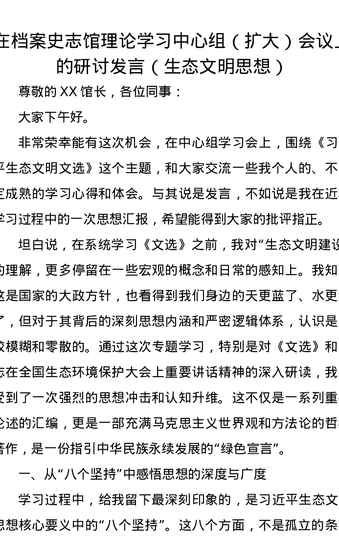 在档案史志馆理论学习中心组(扩大)会议上的研讨发言(生态文明思想)