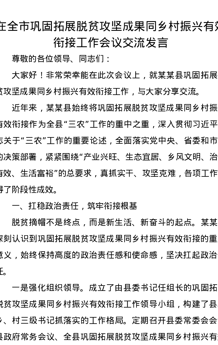 在全市巩固拓展脱贫攻坚成果同乡村振兴有效衔接工作会议交流发言