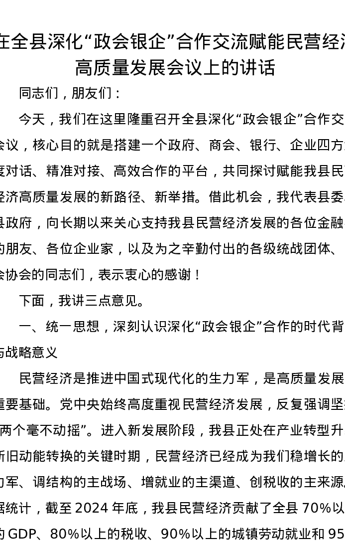 在全县深化政会银企合作交流赋能民营经济高质量发展会议上的讲话