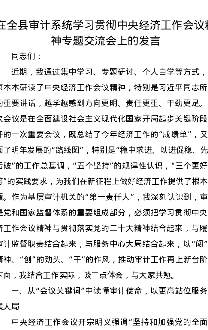 在全县审计系统学习贯彻中央经济工作会议精神专题交流会上的发言
