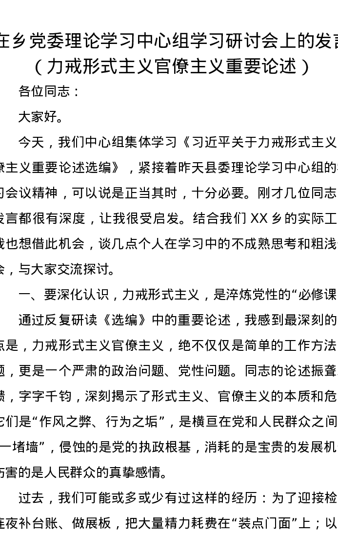 在乡党委理论学习中心组学习研讨会上的发言(力戒形式主义官僚主义重要论述)