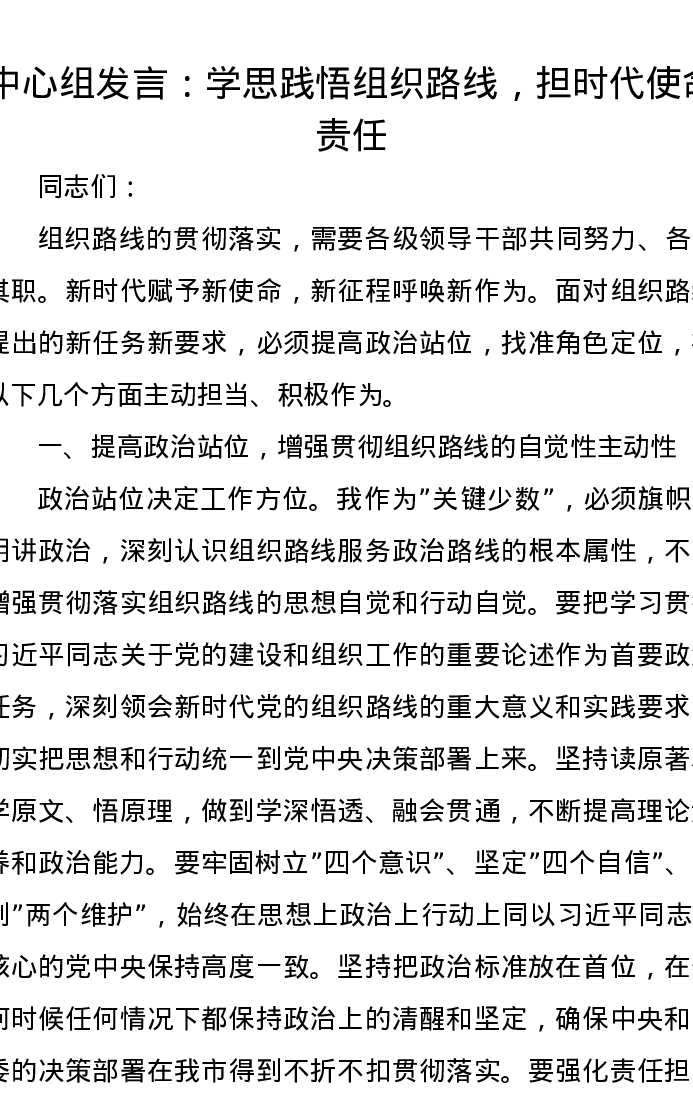 中心组发言:学思践悟组织路线,担时代使命责任