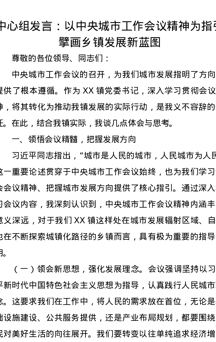 中心组发言:以中央城市工作会议精神为指引,擘画乡镇发展新蓝图