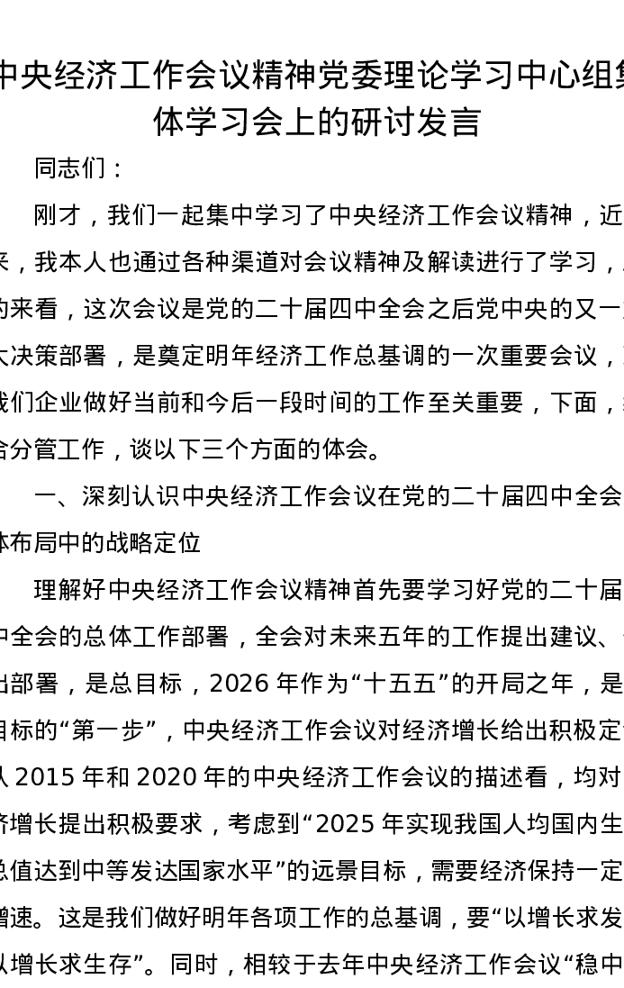 中央经济工作会议精神党委理论学习中心组集体学习会上的研讨发言