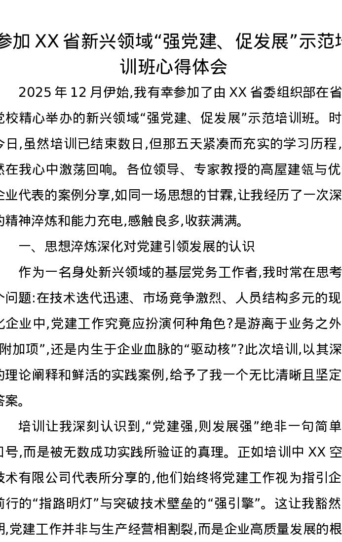 参加XX省新兴领域强党建、促发展示范培训班心得体会