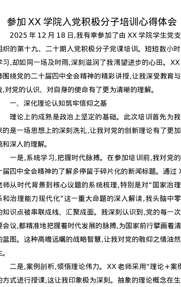 参加XX学院入党积极分子培训心得体会