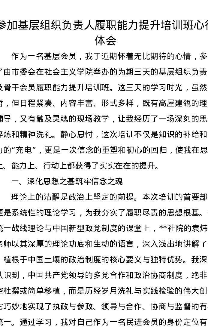 参加基层组织负责人履职能力提升培训班心得体会