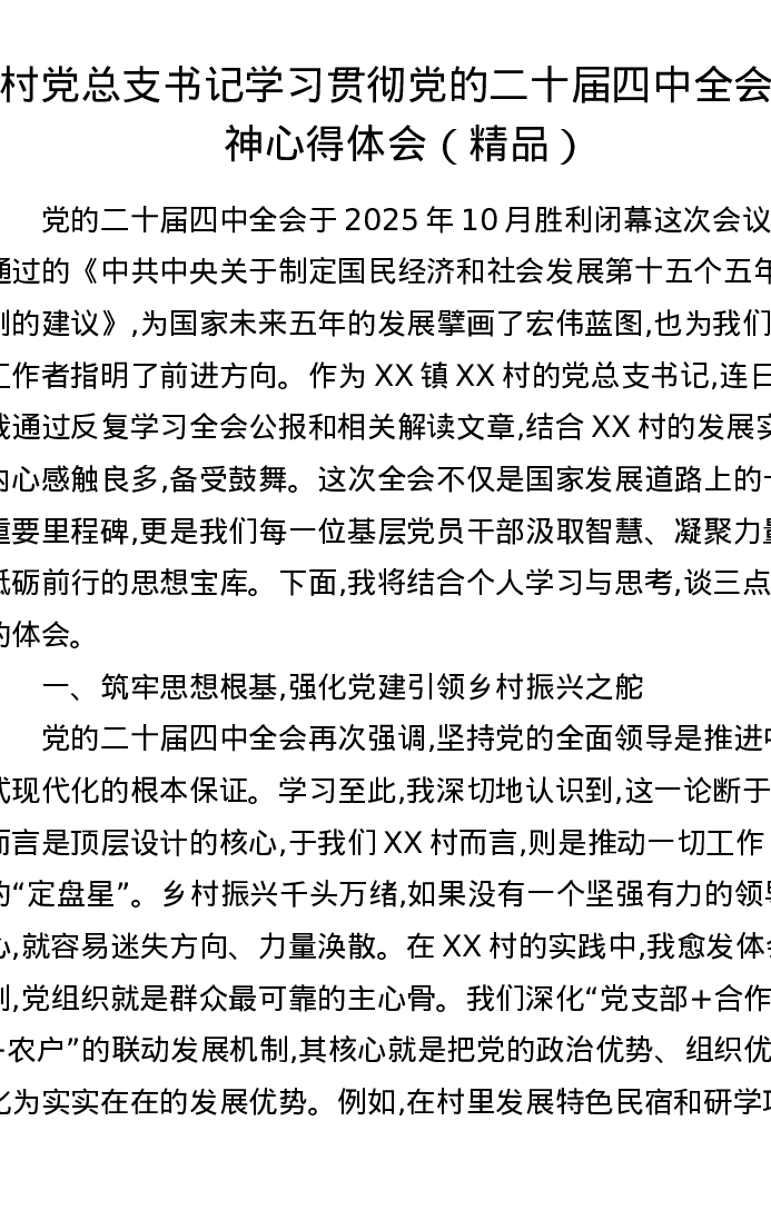 村党总支书记学习贯彻党的二十届四中全会精神心得体会