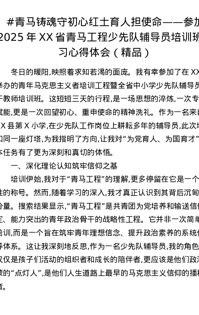 青马铸魂守初心红土育人担使命——参加2025年XX省青马工程少先队辅导员培训班学习心得体会
