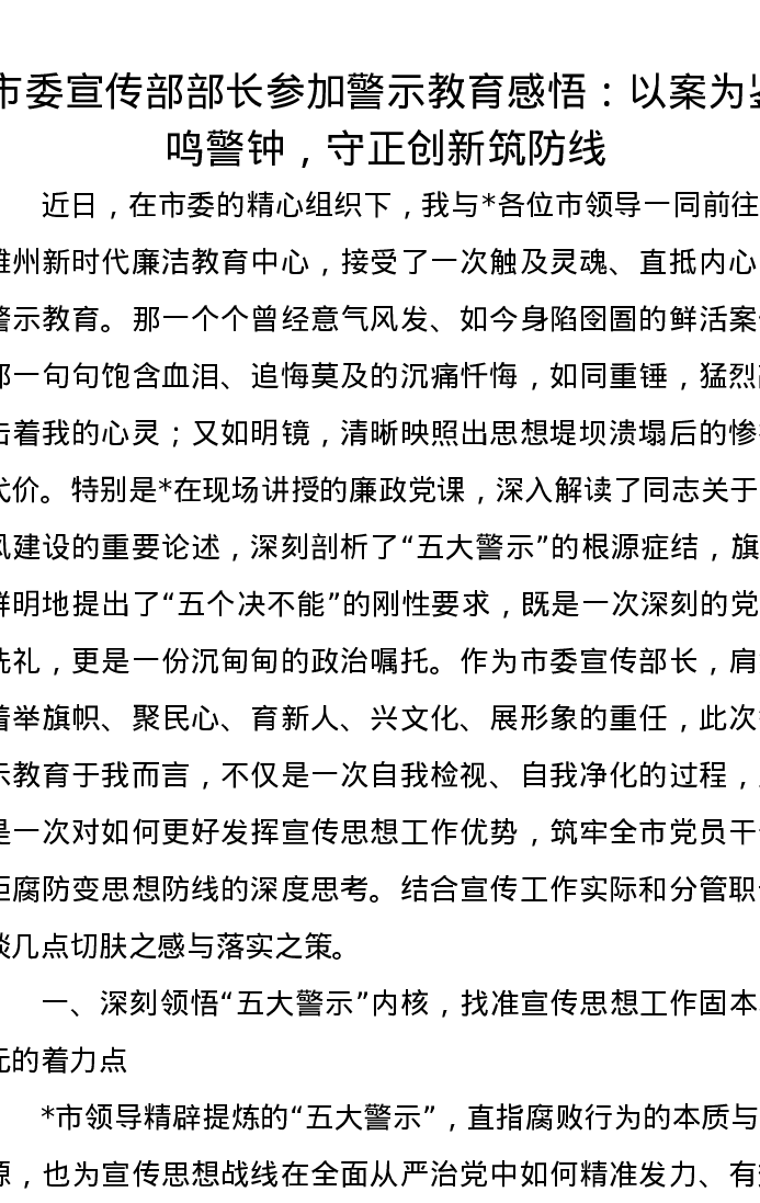 市委宣传部部长参加警示教育感悟:以案为鉴鸣警钟,守正创新筑防线