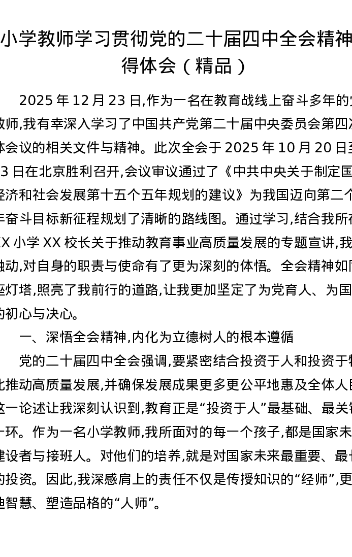 小学教师学习贯彻党的二十届四中全会精神心得体会