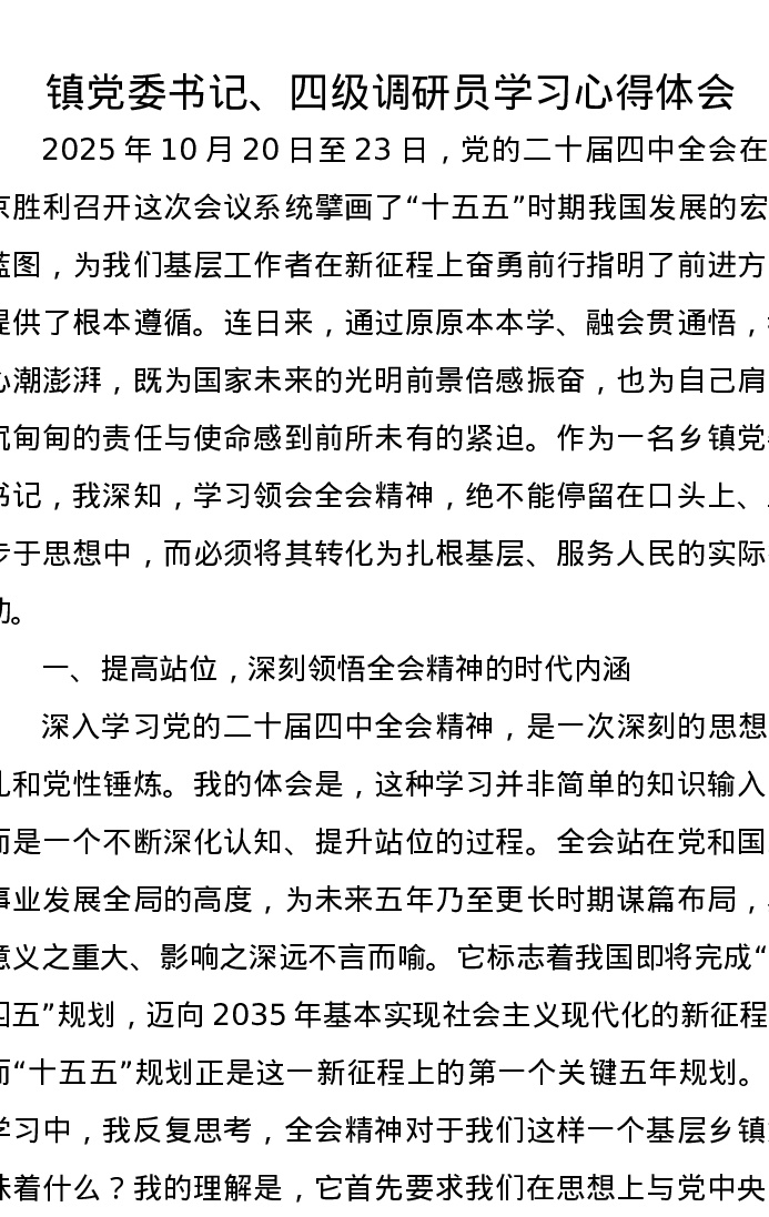 镇党委书记、四级调研员学习心得体会