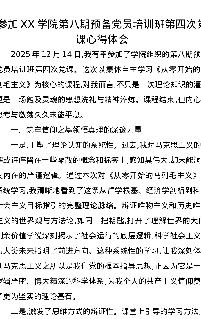 参加XX学院第八期预备党员培训班第四次党课心得体会