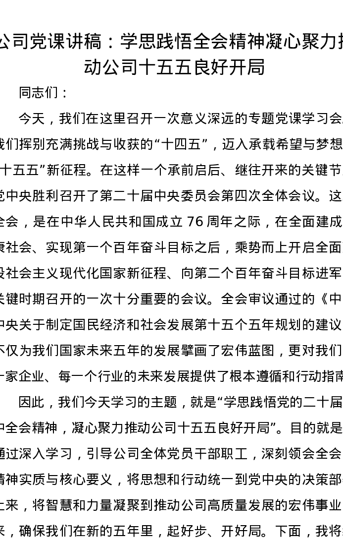 公司党课讲稿:学思践悟全会精神 凝心聚力推动公司十五五良好开局