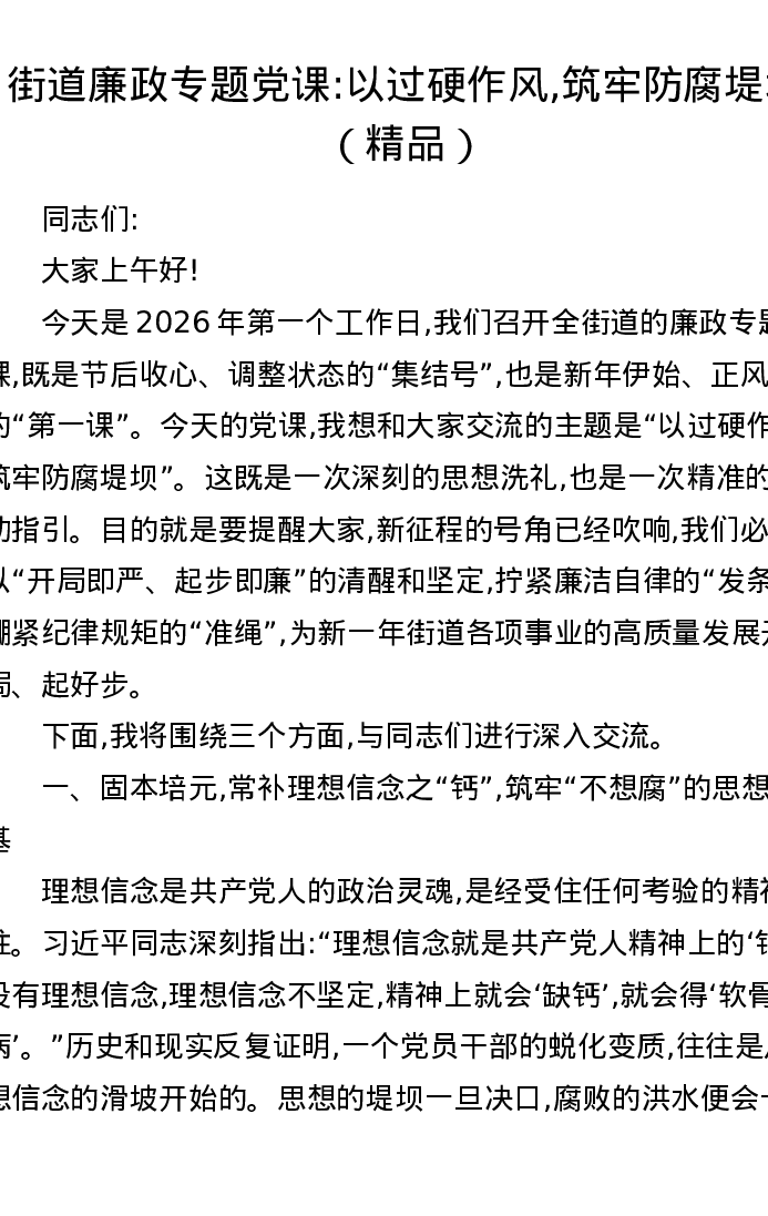街道廉政专题党课讲稿:以过硬作风,筑牢防腐堤坝