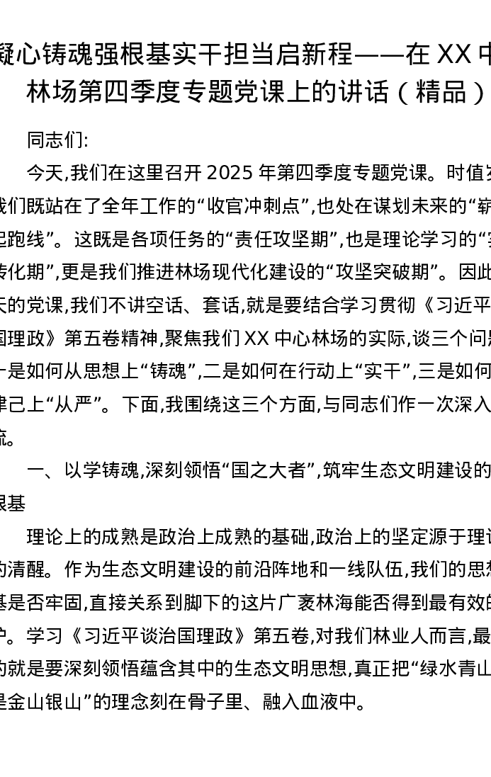 凝心铸魂强根基实干担当启新程——在XX中心林场第四季度专题党课上的讲话