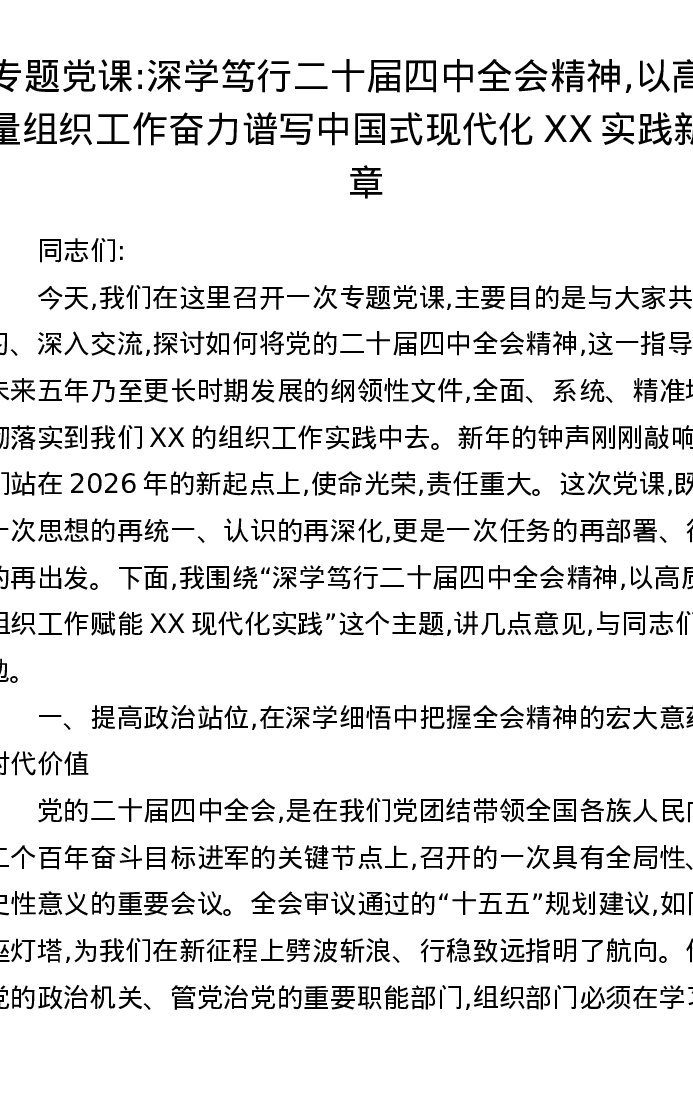 专题党课讲稿:深学笃行二十届四中全会精神,以高质量组织工作奋力谱写中国式现代化XX实践新篇章
