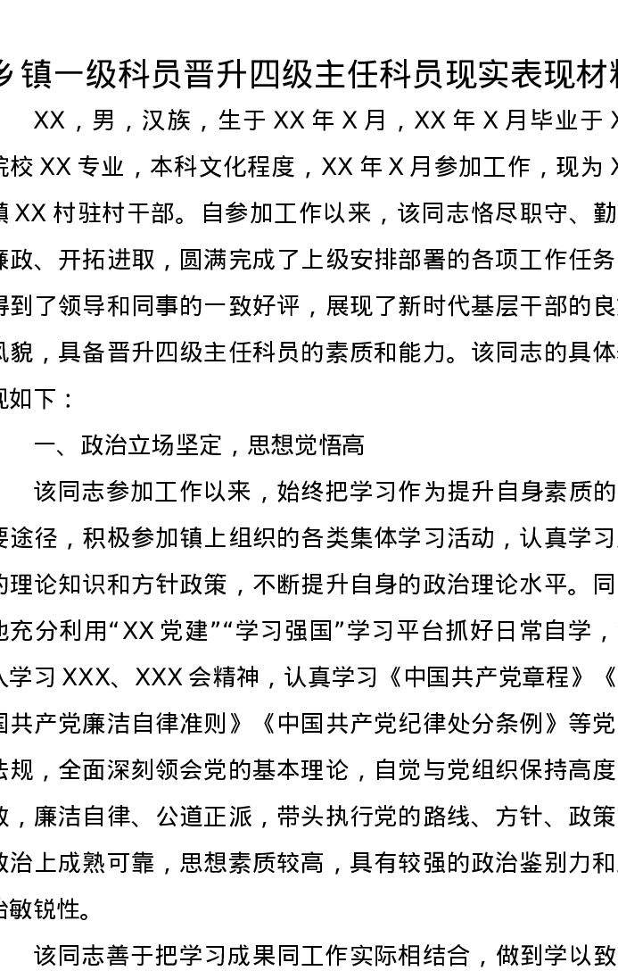 乡镇一级科员晋升四级主任科员现实表现材料