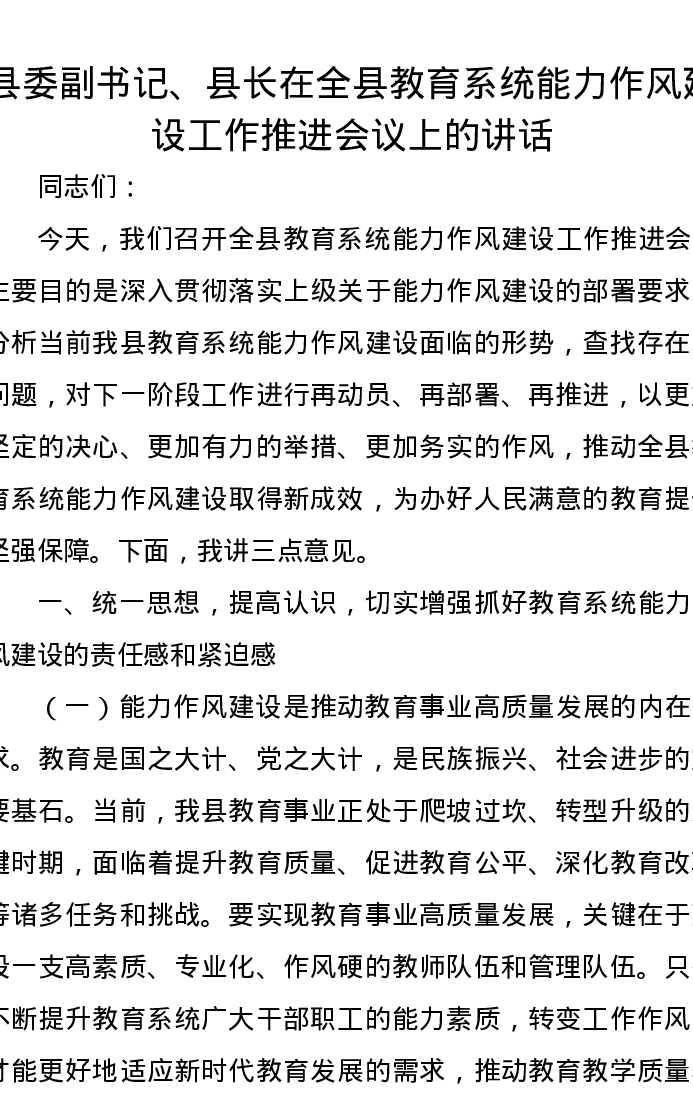 县委副书记、县长在全县教育系统能力作风建设工作推进会议上的讲话