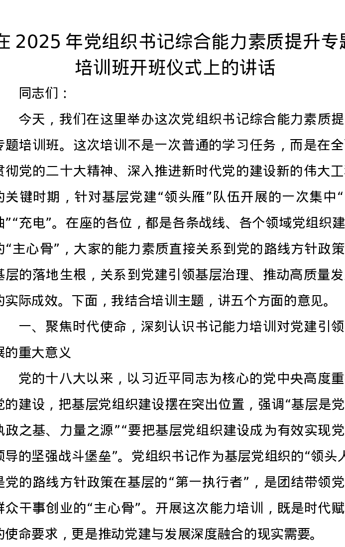 在2025年党组织书记综合能力素质提升专题培训班开班仪式上的讲话