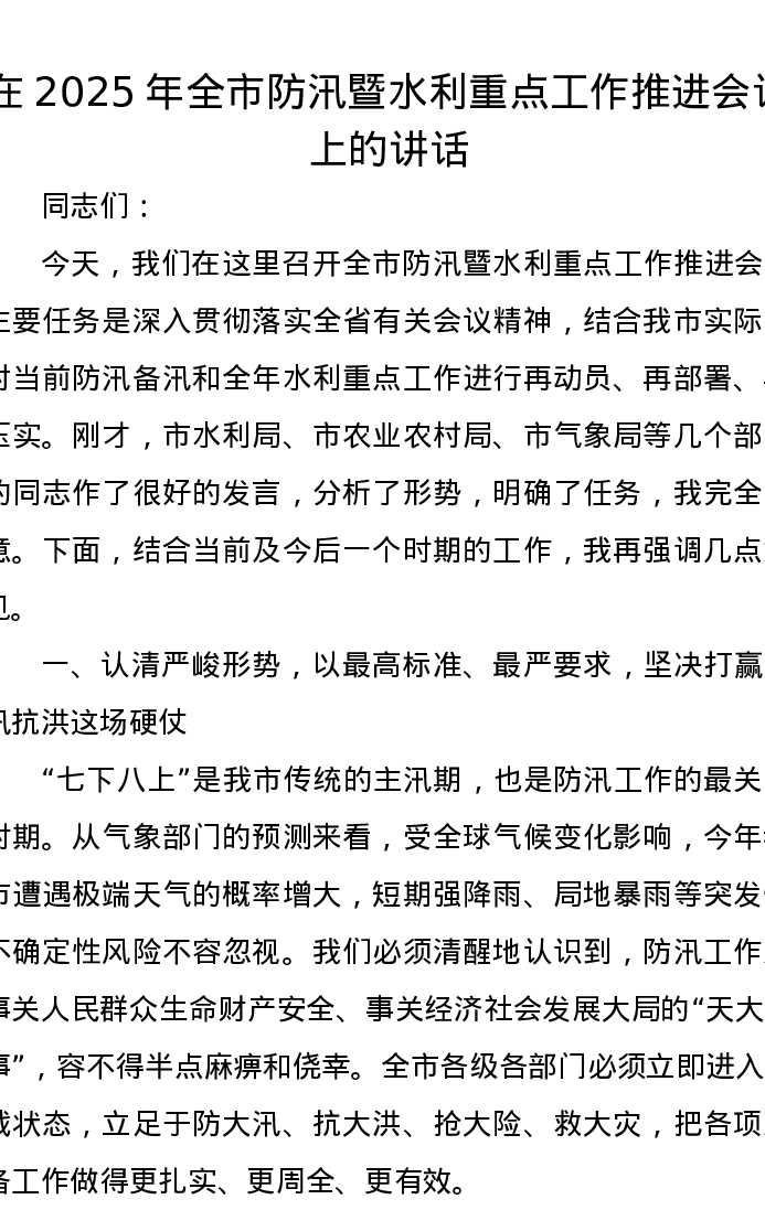 在2025年全市防汛暨水利重点工作推进会议上的讲话