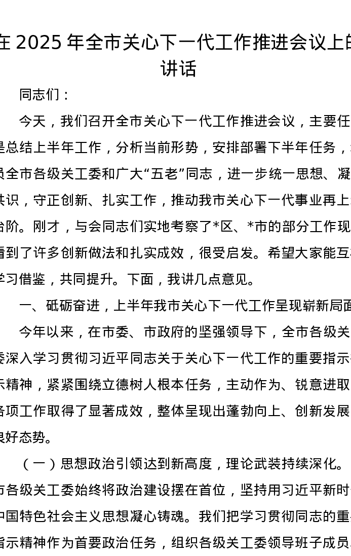在2025年全市关心下一代工作推进会议上的讲话