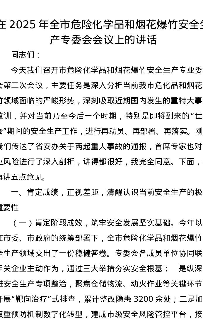 在2025年全市危险化学品和烟花爆竹安全生产专委会会议上的讲话