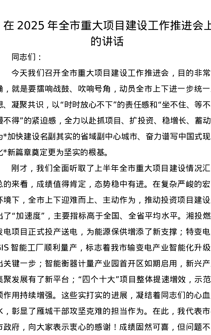 在2025年全市重大项目建设工作推进会上的讲话