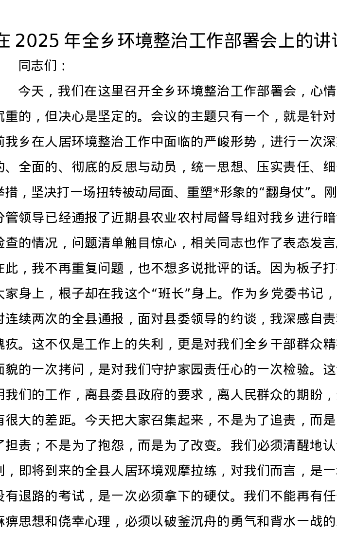 在2025年全乡环境整治工作部署会上的讲话