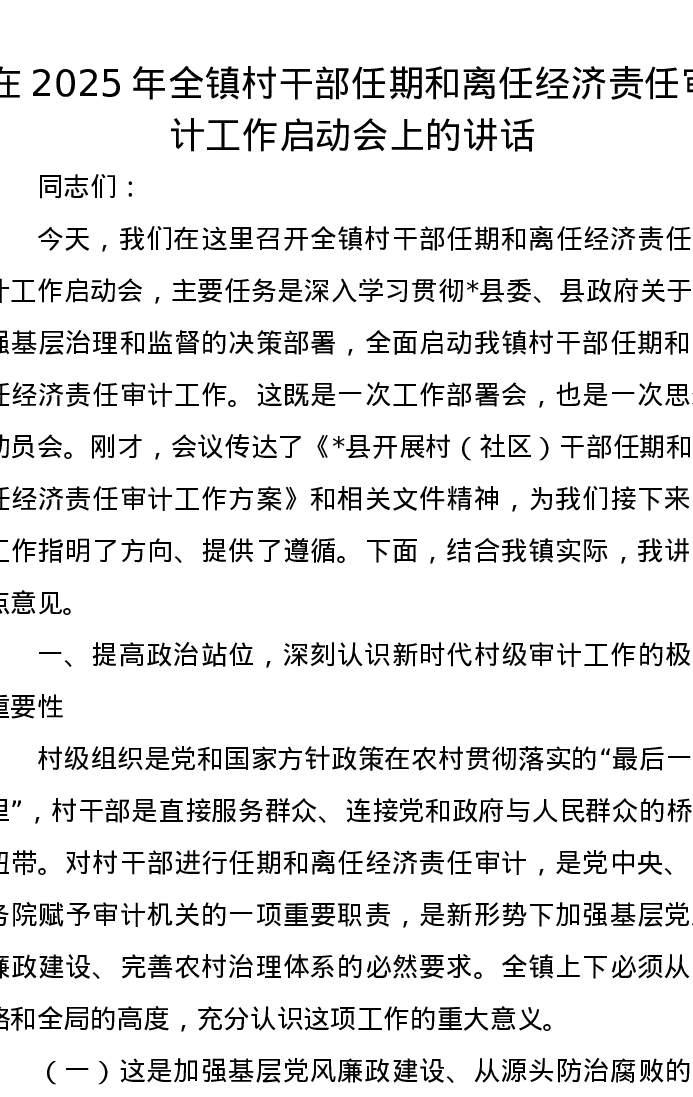 在2025年全镇村干部任期和离任经济责任审计工作启动会上的讲话