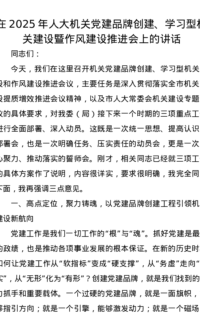 在2025年人大机关党建品牌创建、学习型机关建设暨作风建设推进会上的讲话