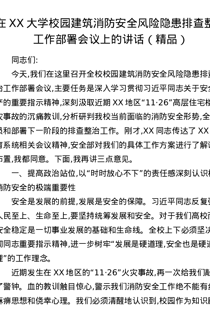 在XX大学校园建筑消防安全风险隐患排查整治工作部署会议上的讲话