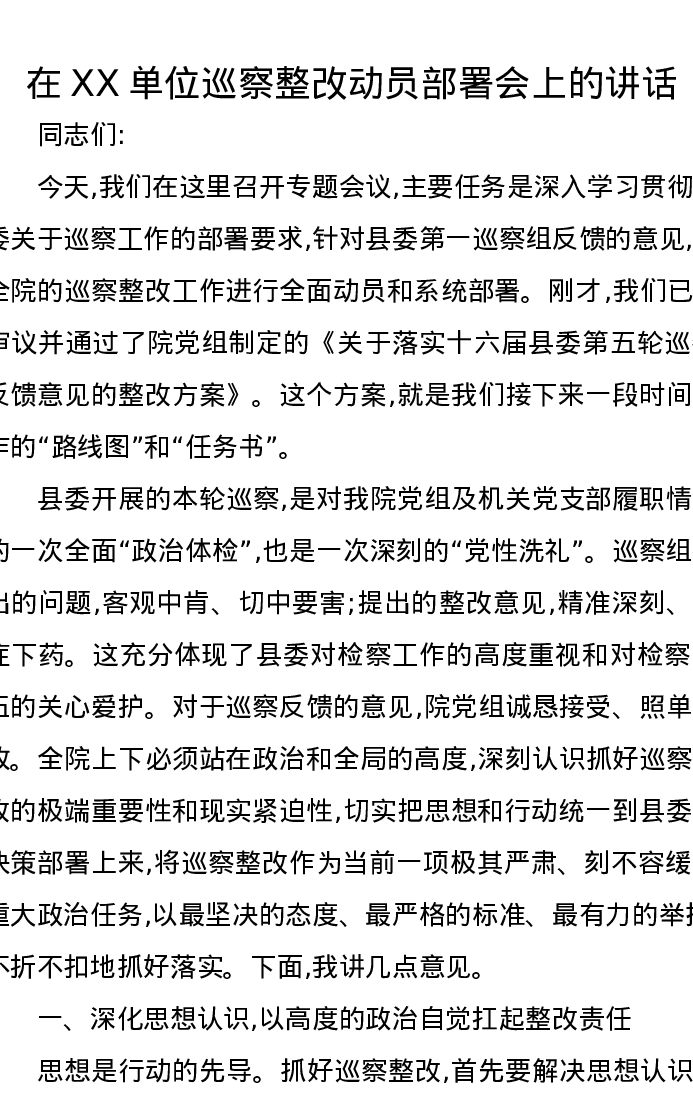 在XX单位巡察整改动员部署会上的讲话